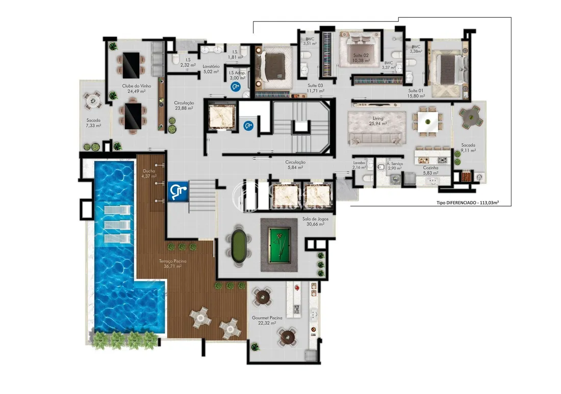Área privativa de apartamento do Tipo 3: 113,18 m²